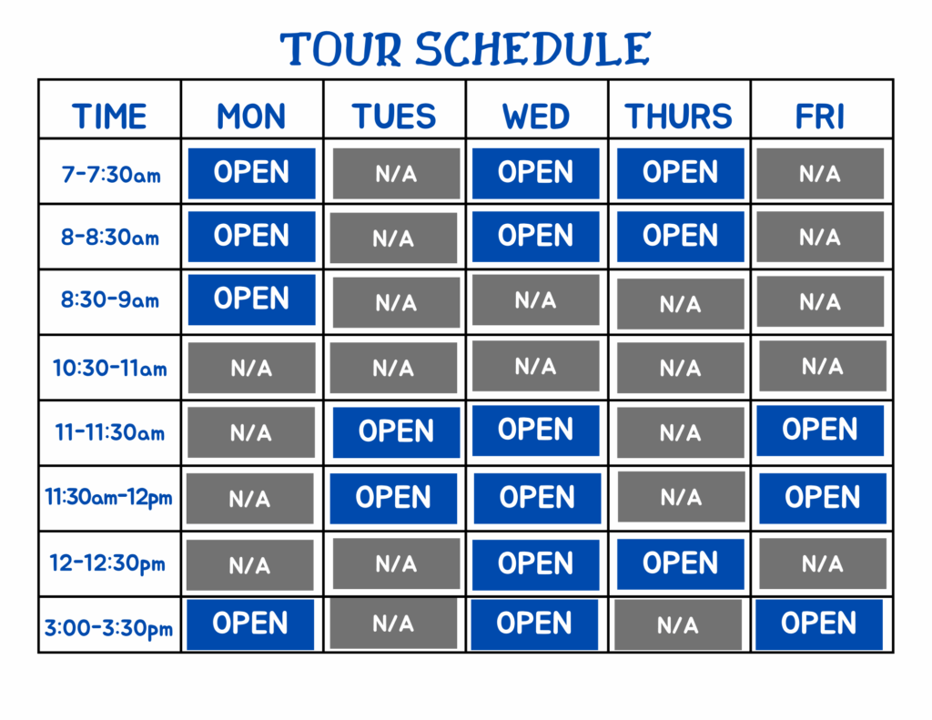 Schedule a Tour! Please see the open times below to set up.